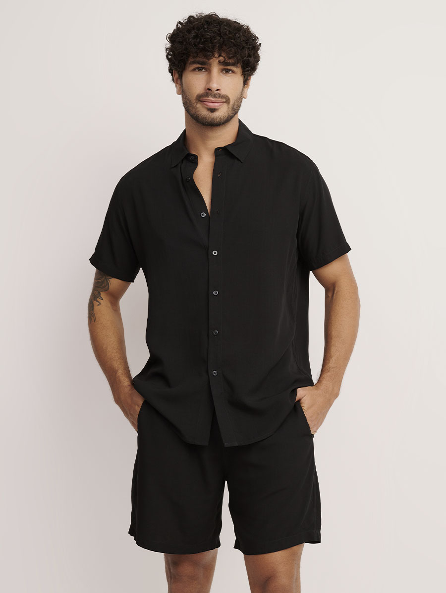 Dica Belles: aposte na combinação da Bermuda Preta com a Camisa Preta ou Camisa Verde da Linha Man para criar um look sofisticado, confortável e cheio de personalidade.