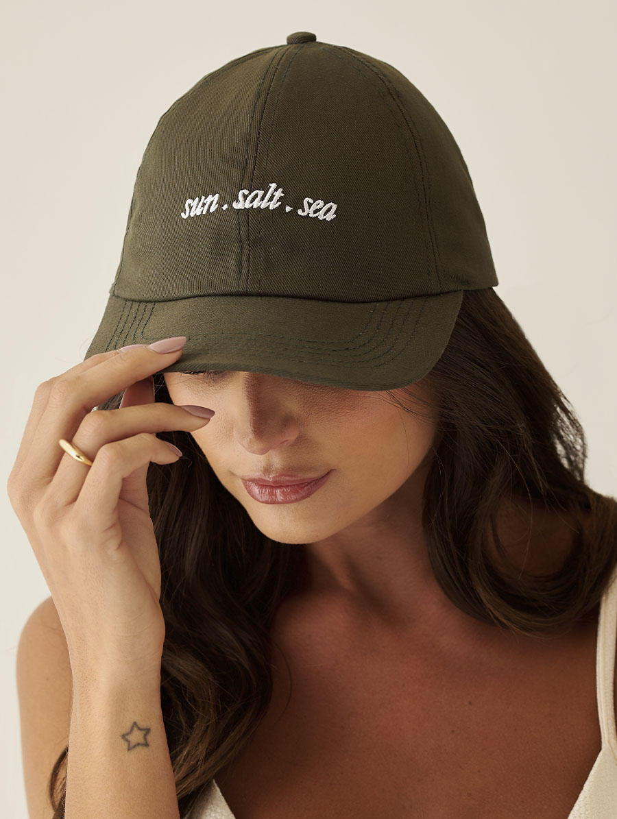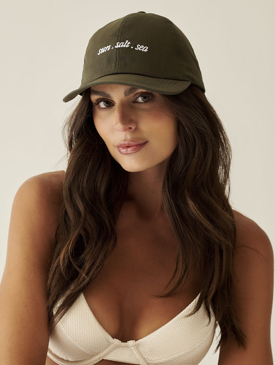 Com aba curvada que protege sem perder o charme e modelagem anatômica com seis painéis costurados, o ajuste fica impecável. O grande destaque é o bordado frontal “Sun Salt Sea”, que traduz o lifestyle da coleção: vibração solar, naturalidade e o frescor do mar.
