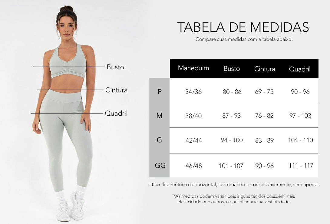 Escolha seu tamanho habitual: P veste 34-36; M veste 38-40; G veste 42-44