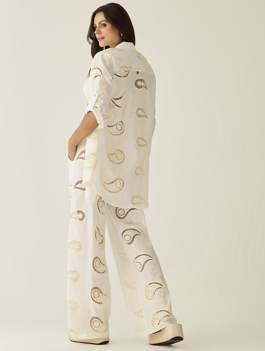 O bordado paisley vazado em alto relevo adiciona textura e identidade artesanal, elevando a peça a outro nível. Para completar, possui bolsos funcionais, tornando o look ainda mais versátil no dia a dia.