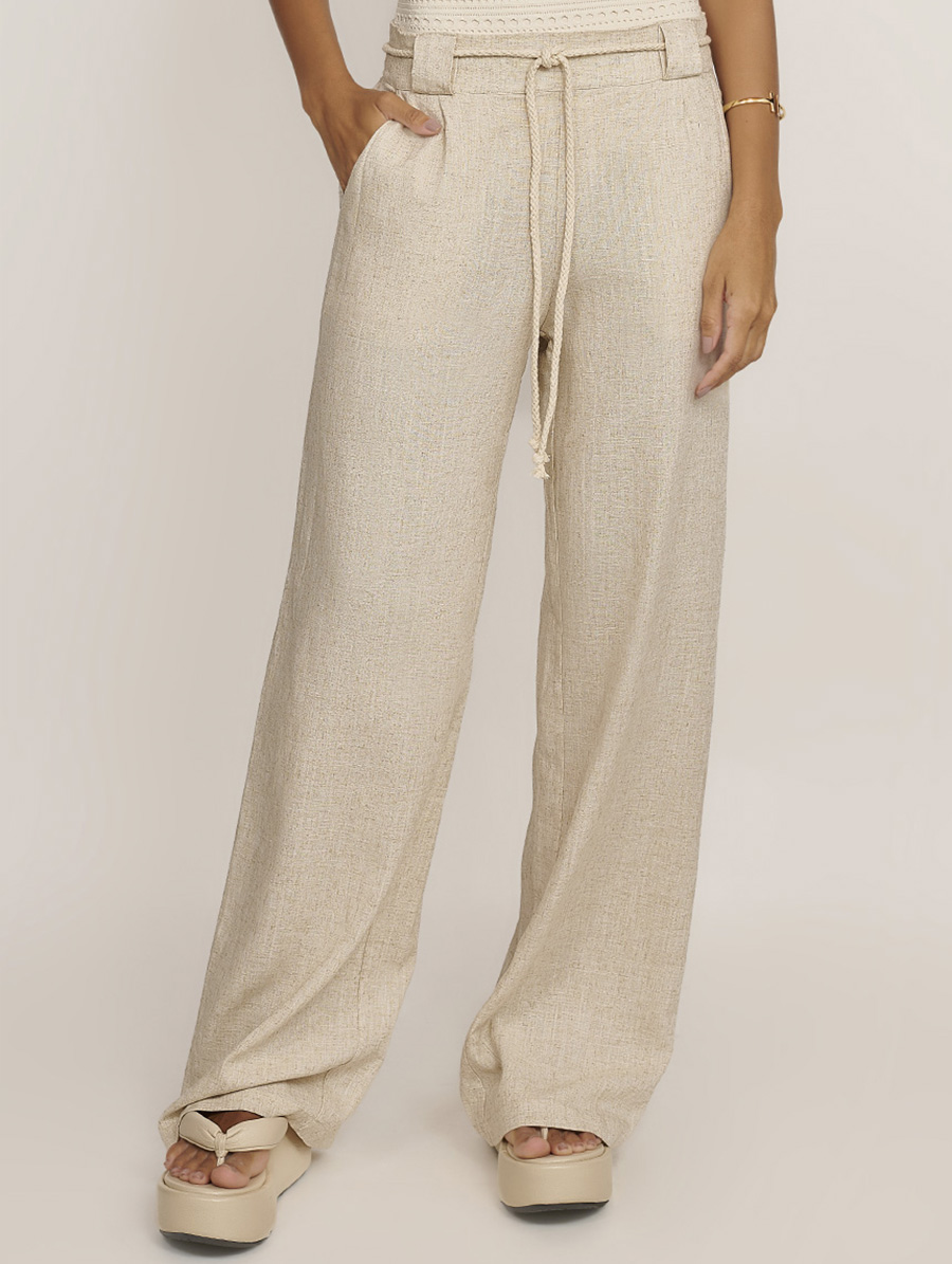 Com caimento fluido e toque rústico, a Calça Pantalona Brisa traz o frescor dos dias de verão em um visual elegante e descomplicado. Confeccionada em viscolinho natural, ela tem modelagem ampla e longa. A cintura é marcada com passadores largos e cordão para amarração. A parte traseira possui elástico garantindo conforto e ajuste perfeito.