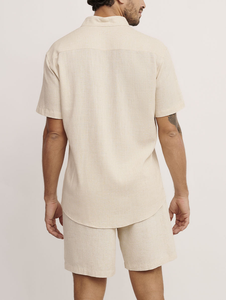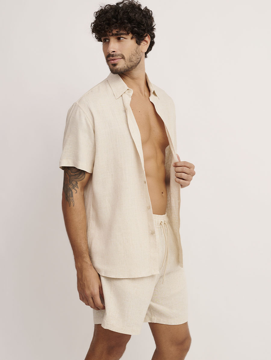Dica Belles: combine a Camisa em Linho Cru Linha Man com a Bermuda em Linho Verde ou a Bermuda com Bolsos em Linho Cru mesma linha para combinar sem abrir mão do estilo.