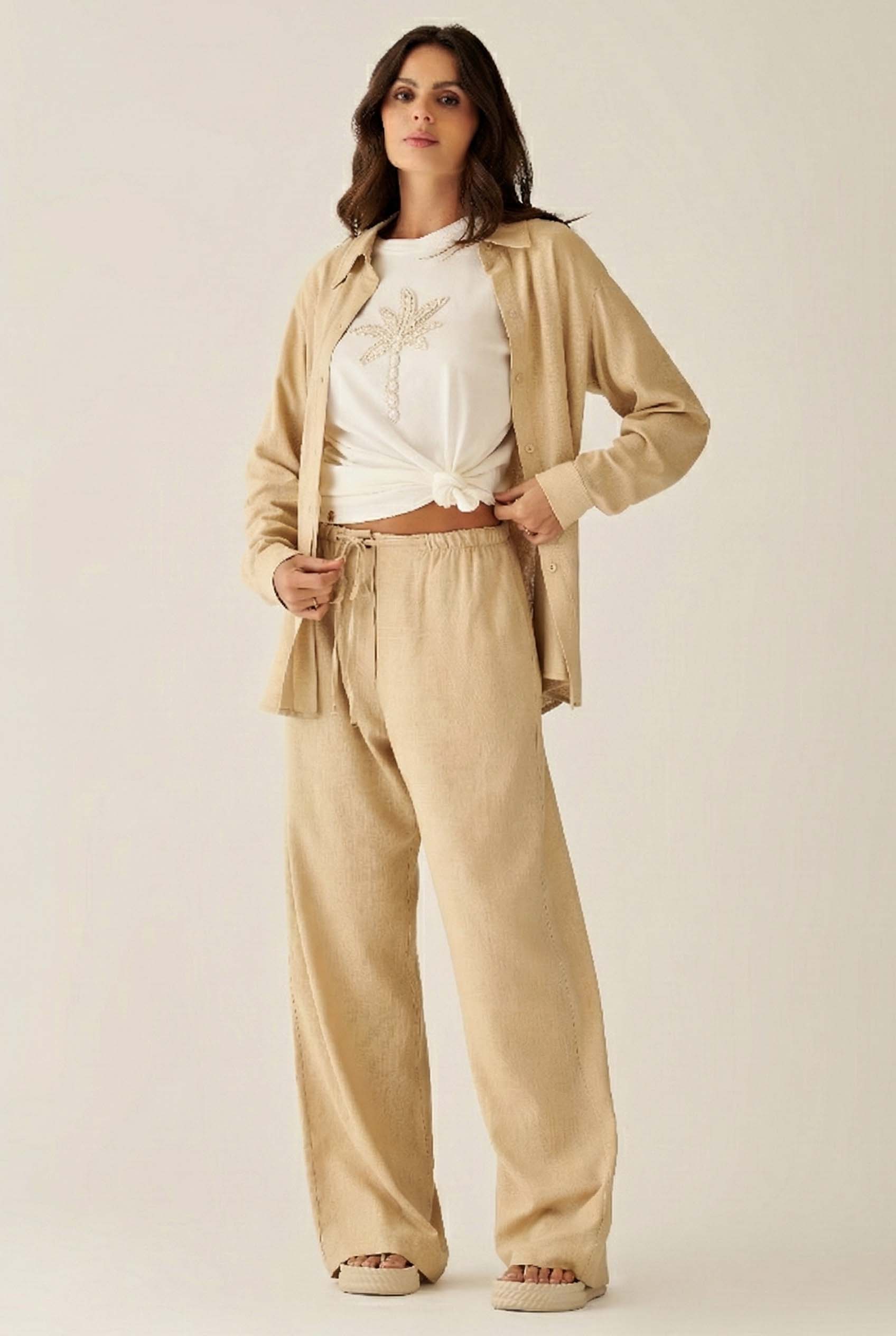 Calça Comprida Areia com Botões e Amarração Luzente