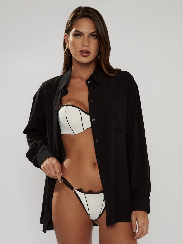 Dica Belles: Para um visual moderno, combine a Chemise Curta Riviera com Tops e Calcinhas da mesma linha ou use sobre um Maiô Riviera para um look City to Beach.