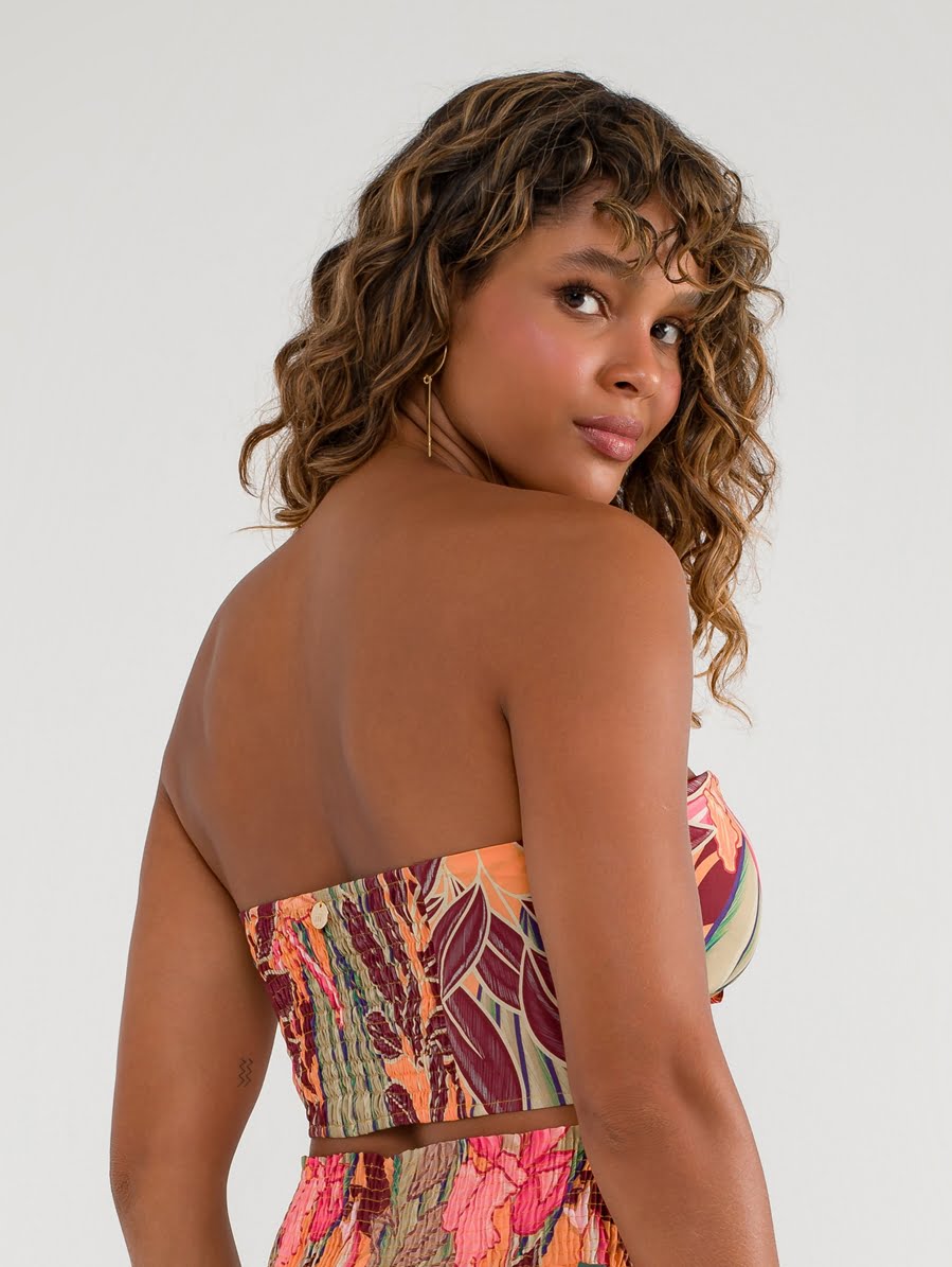 O Cropped Bustiê Poente é uma peça moderna, versátil e despojada. Produzido em tecido milos duplo com estampa exclusiva, possui modelagem versátil podendo ser usada como tomara que caia ou com amarração no pescoço. O decote possui tiras embutidas para ajuste franzido e amarração. O lástex nas costas garante um ajuste perfeito e ajustável ao corpo ao vestir. Escolha perfeita para compor looks incríveis e ajuste impecável em qualquer ocasião!