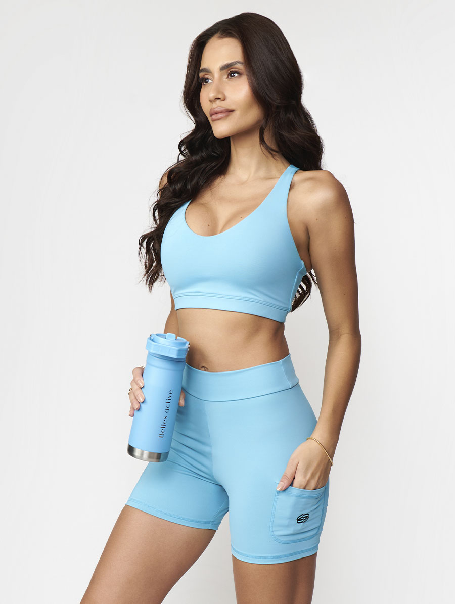 Short Curto Fitness Cós Alto e Bolsos Azul Azzure