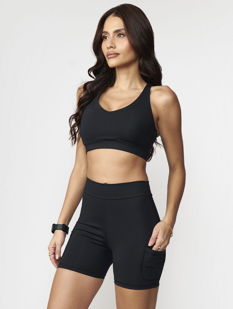 Short Curto Fitness Cós Alto e Bolsos Preto
