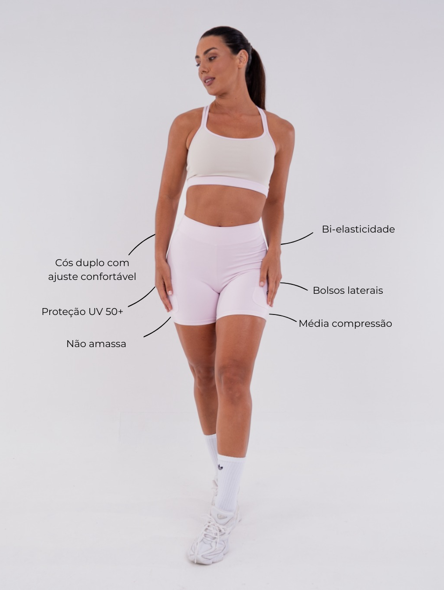 Este Short Curto é perfeito para quem vive o conceito athleisure e busca funcionalidade. Possui bolsos laterais discretos para carregar o essencial, liberando suas mãos para o treino. A tecnologia do tecido inclui Proteção UV 50+, essencial para suas atividades ao ar livre, e bilasticidade, garantindo máxima liberdade de movimento. É a escolha perfeita para corredoras, praticantes de academia ou para compor um look esportivo no dia a dia.