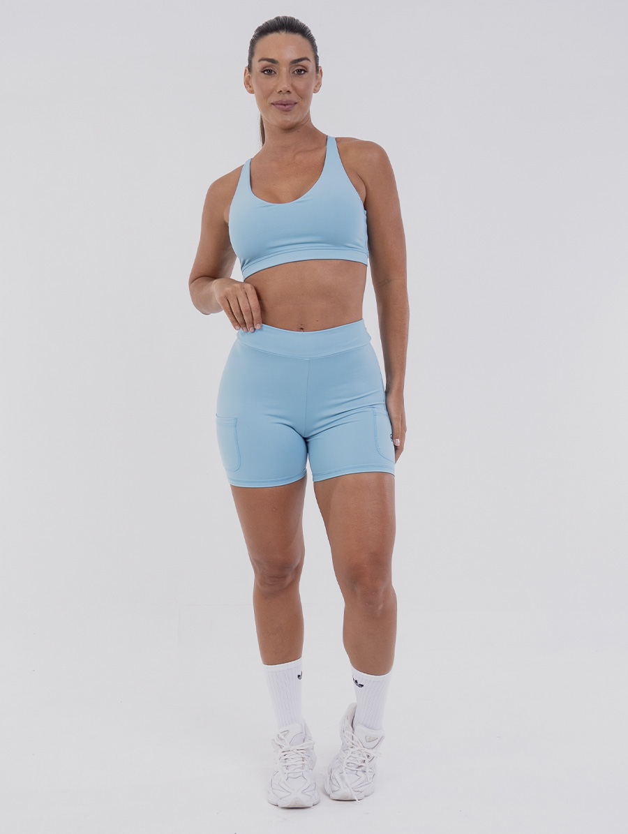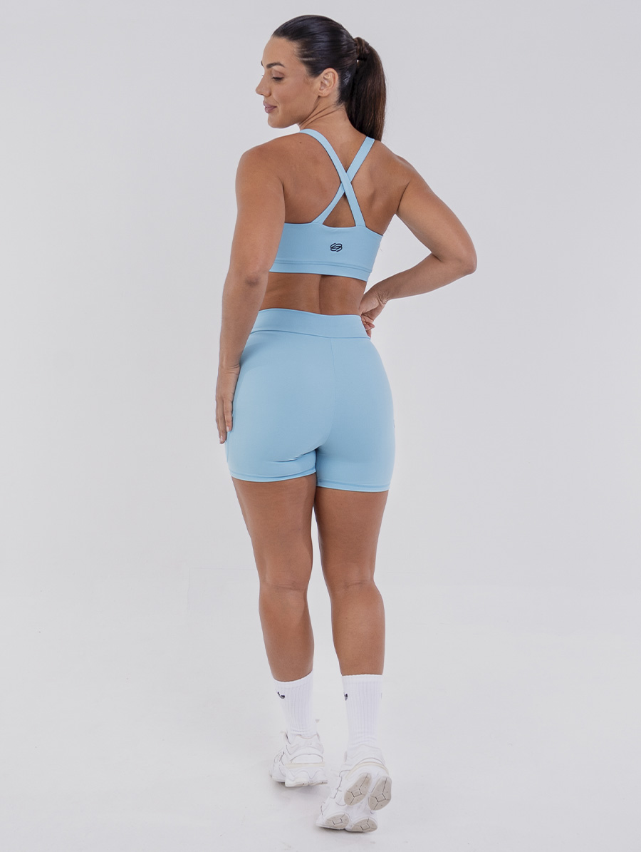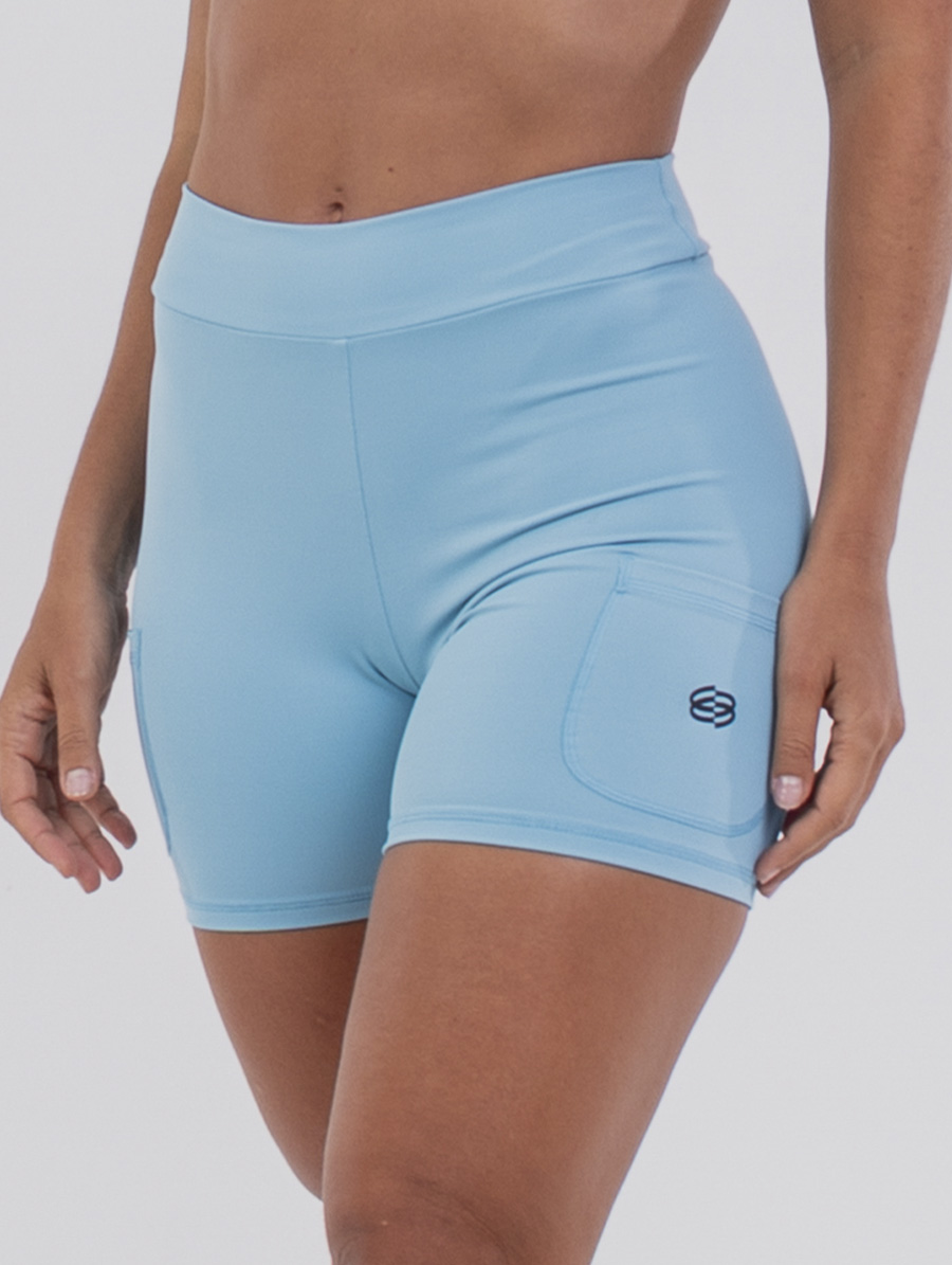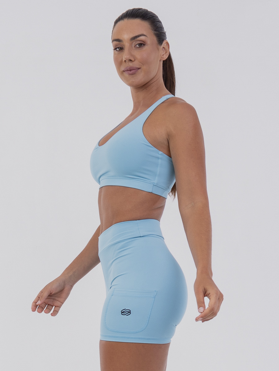 Short Curto Fitness Cós Alto e Bolsos Azul Azzure