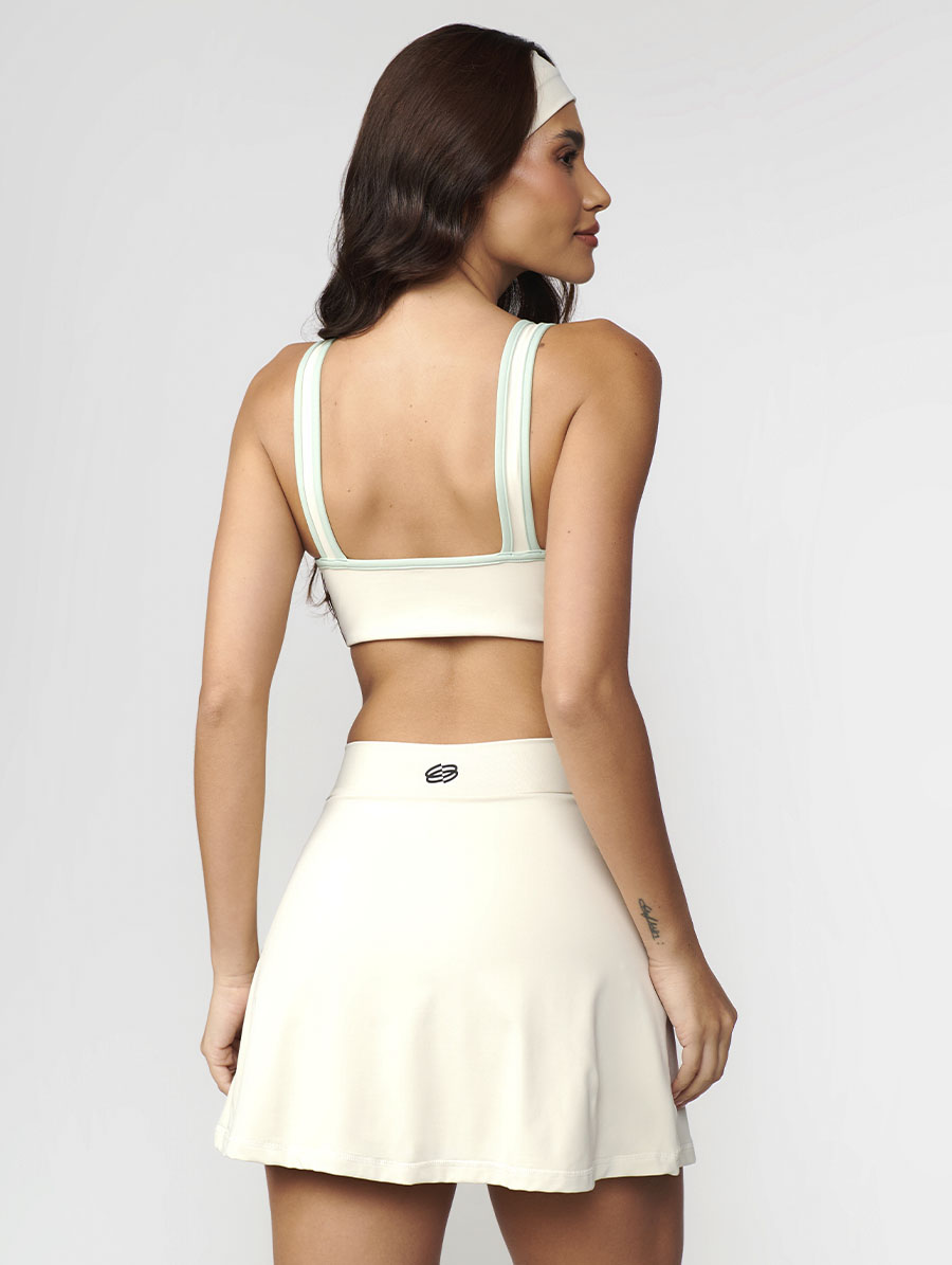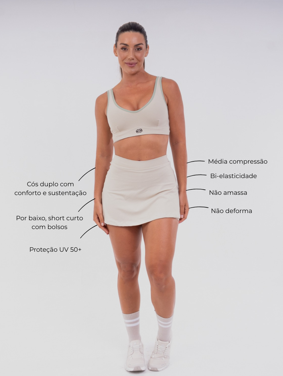 Dica Belles: não limite a versatilidade! O Short Saia Verde Aloe transita facilmente das quadras de Beach Tennis para o treino na academia ou um passeio casual. Combine-o com um top esportivo branco e um boné para um look esportivo e super moderno de athleisure.