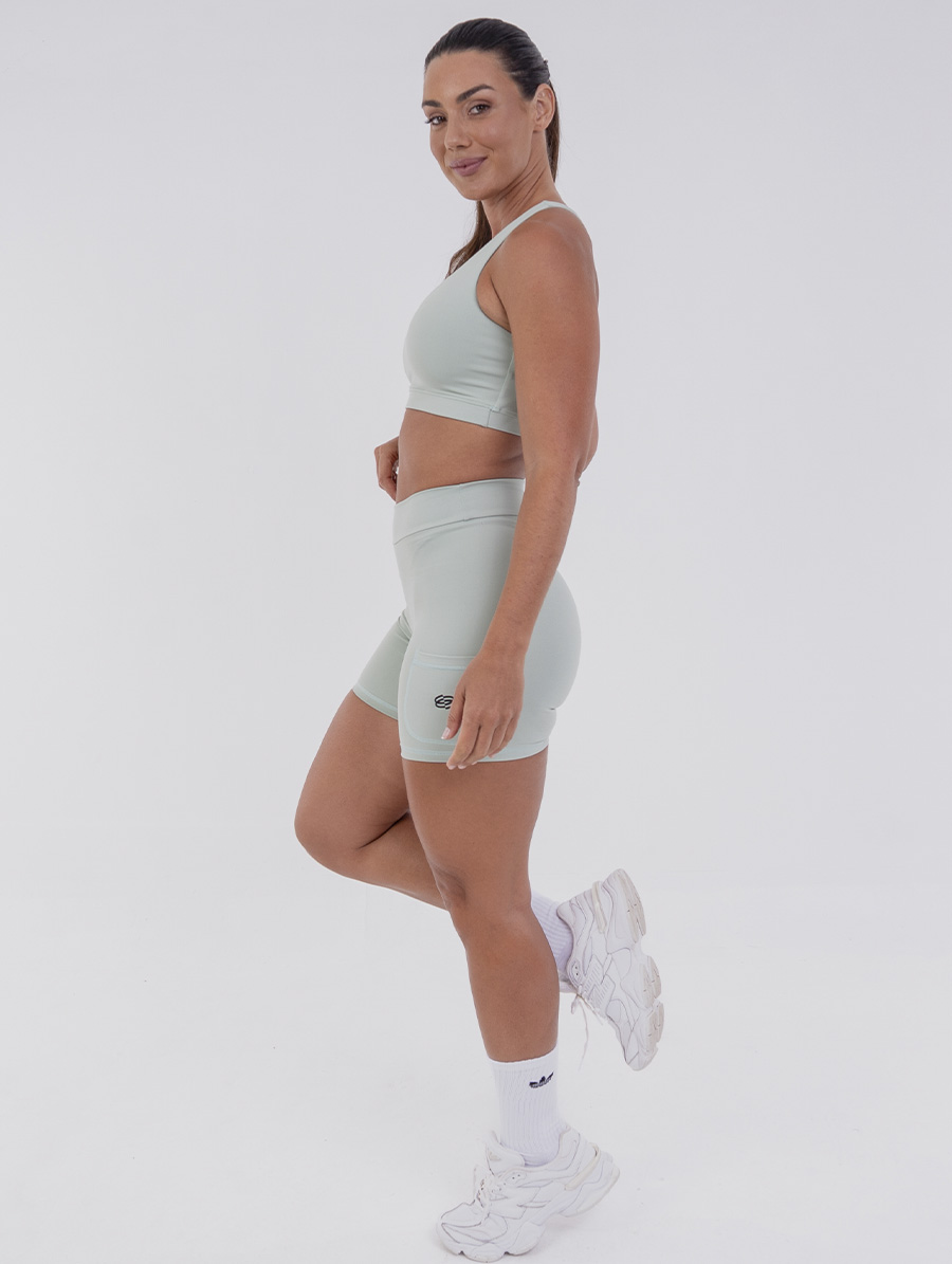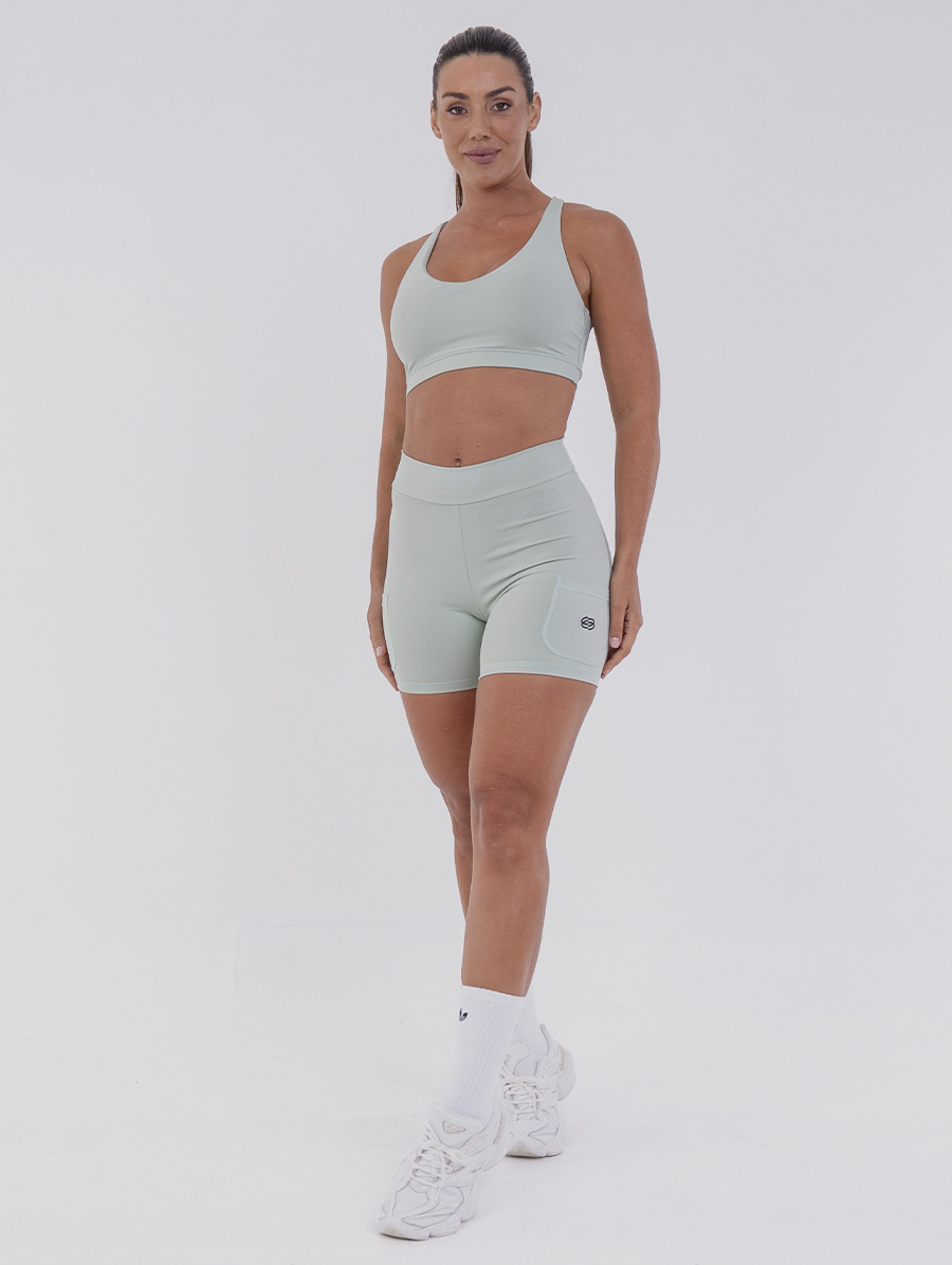 Short Curto Fitness Cós Alto e Bolsos Verde Aloe