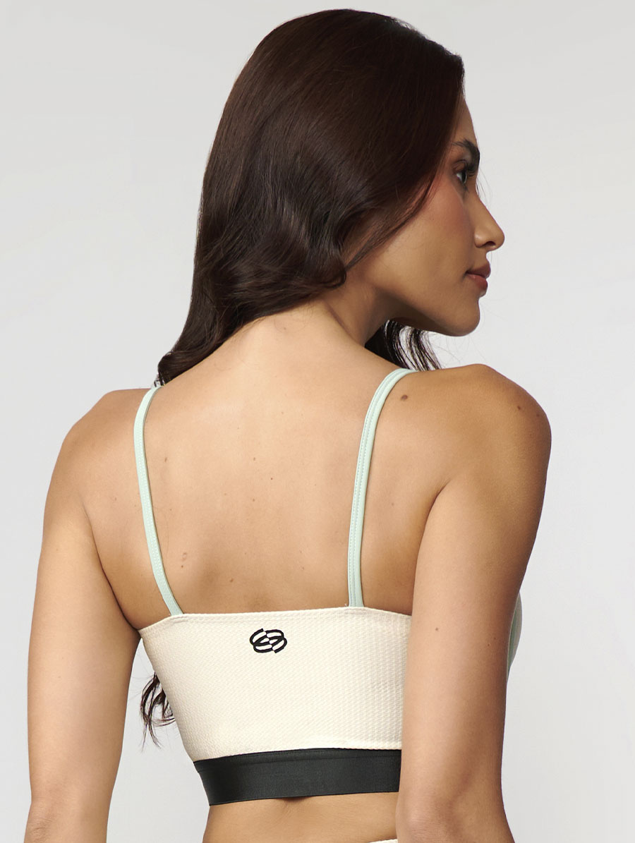 Com baixa transparência e média compressão, é perfeito tanto para treinos quanto para composições athleisure, combinando moda e funcionalidade; decote reto é valorizado pelo elástico fino contornando o busto até as alças, enquanto o elástico aparente sob o busto garante suporte adicional sem comprometer o conforto.