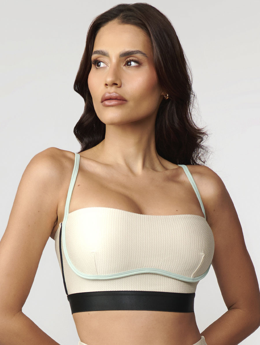 Decote reto com elástico fino, oferecendo suporte e conforto