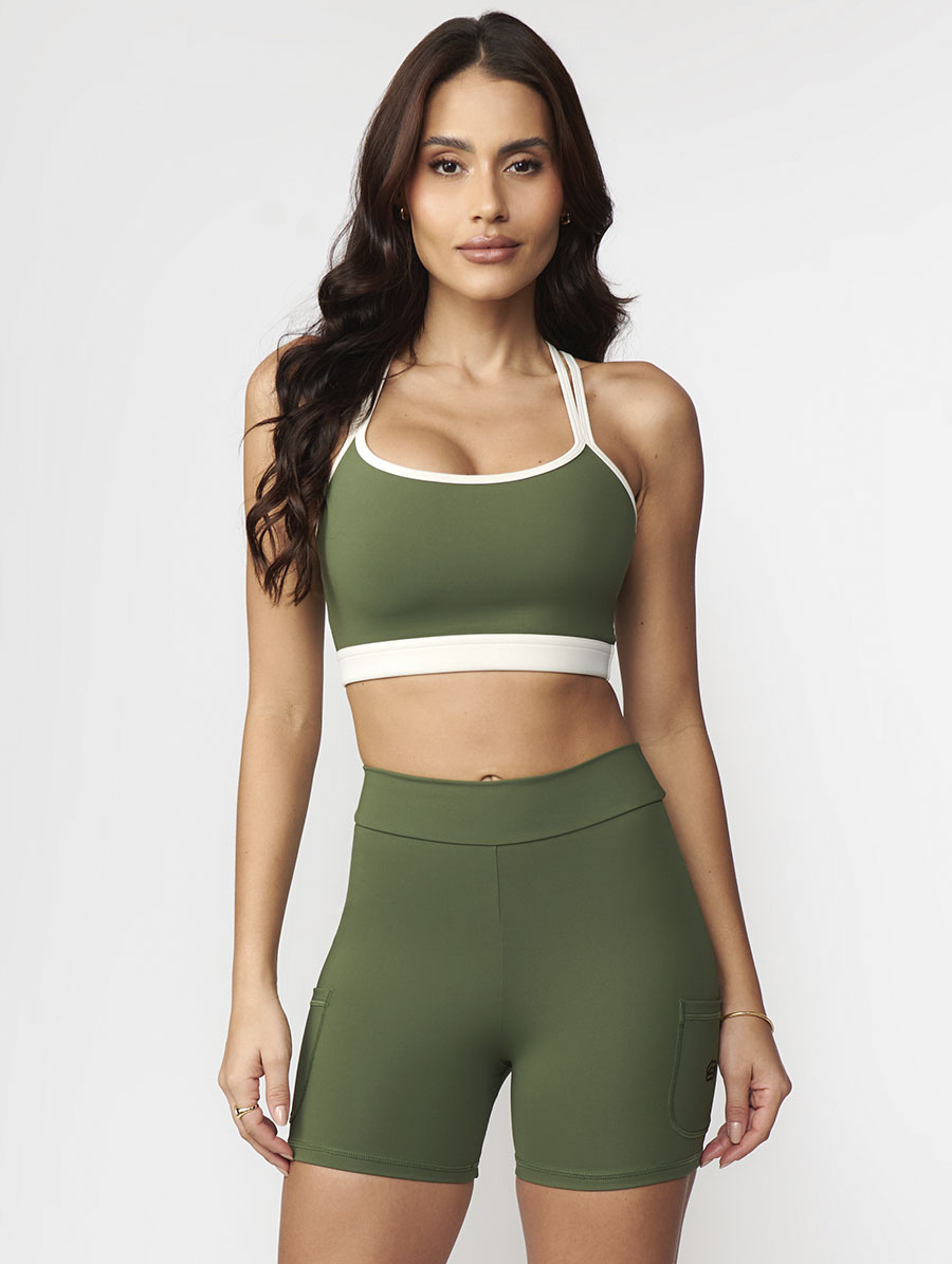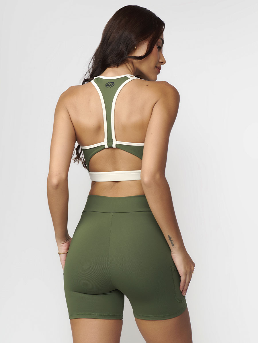 - Design Bicolor Moderno: Combinação de Verde Cacto e Off White, criando um visual arrojado de moda fitness.