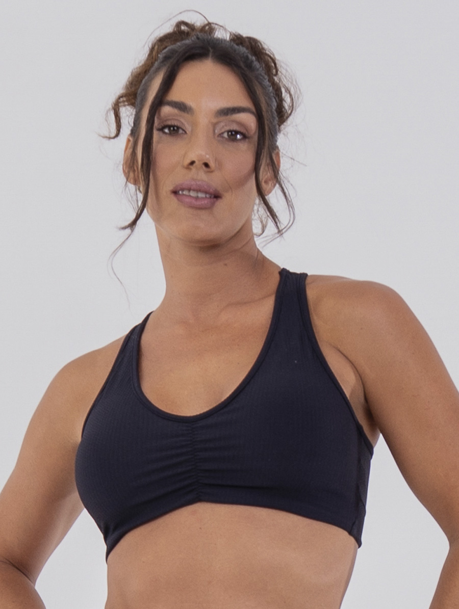 Com bojos removíveis e um detalhe franzido no centro do busto, o top valoriza a silhueta de forma natural, unindo sustentação e feminilidade. A pala com elástico nas costas proporciona ajuste firme e seguro, sem restringir os movimentos — perfeita combinação entre leveza e suporte.