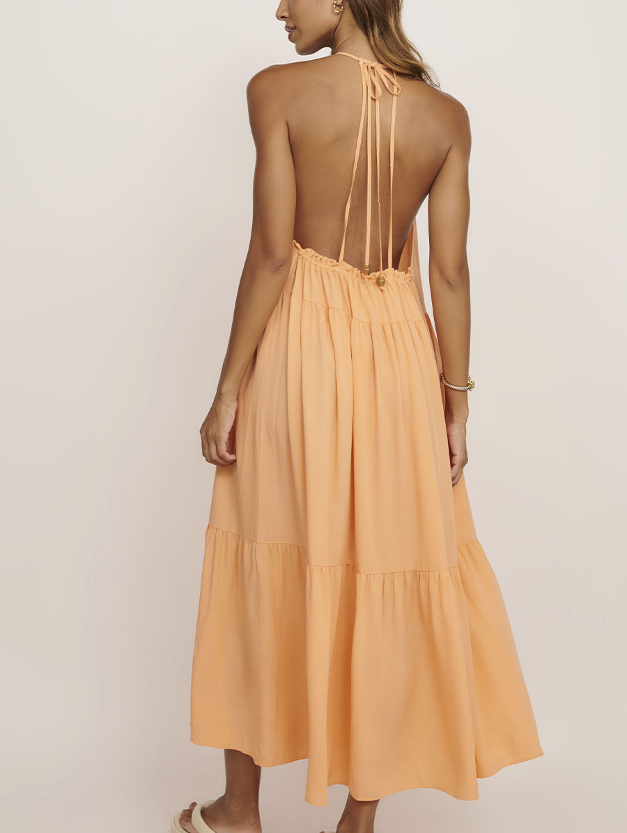 Com modelagem frente única e decote franzido, o vestido valoriza a silhueta de maneira elegante, enquanto o decote traseiro profundo com tiras para amarração finalizadas em ponteiras acrílicas adiciona charme e versatilidade ao look. A medalhinha de metal personalizada reforça a exclusividade da peça, garantindo um detalhe sofisticado que se destaca em qualquer ocasião.
