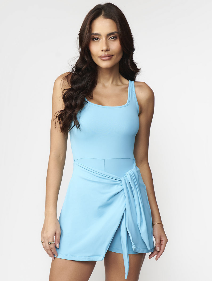 A modelagem combina shorts embutido com saia sobreposta, criando um visual moderno e feminino. As alças estilo camiseta e o decote arredondado valorizam o colo de forma sutil, enquanto o forro frontal sem bojos assegura conforto em todos os momentos. O detalhe de amarração lateral permite ajustar o caimento ao corpo, realçando a silhueta com charme e funcionalidade.