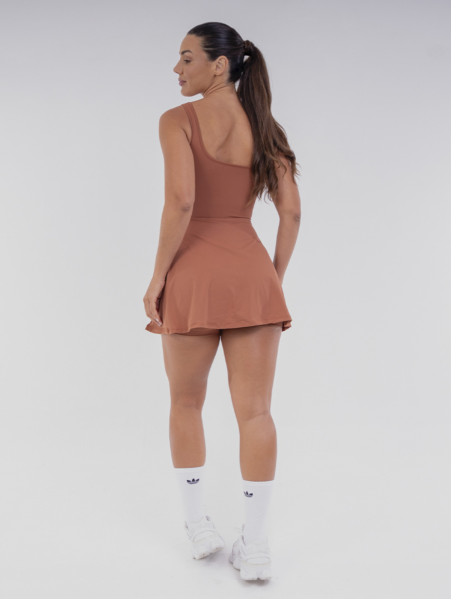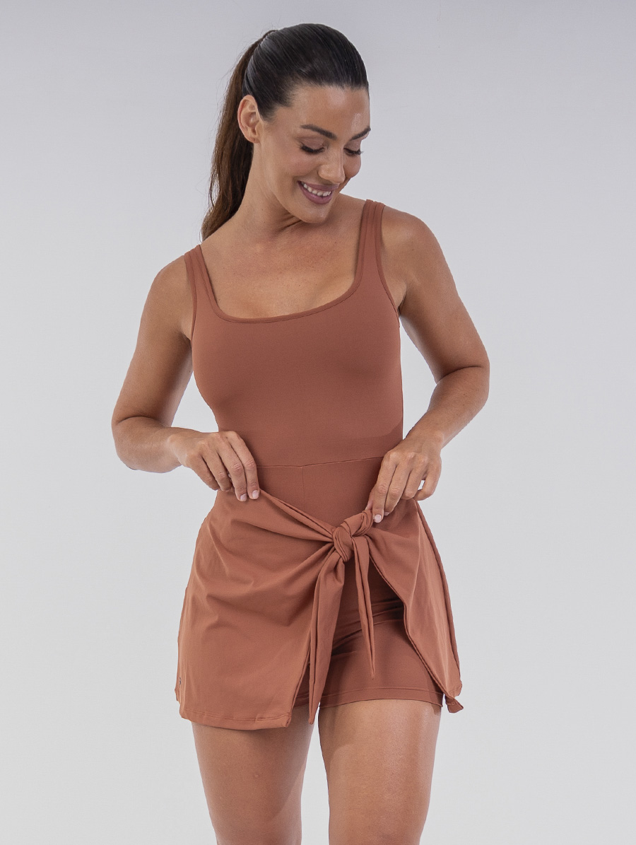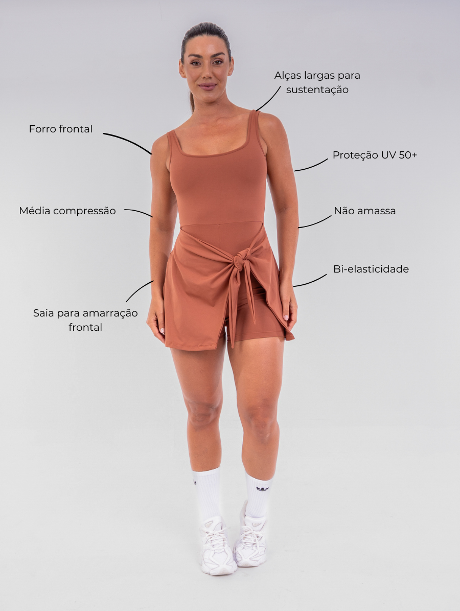 A modelagem combina shorts embutido com saia sobreposta, criando um visual moderno e feminino. As alças estilo camiseta e o decote arredondado valorizam o colo de forma sutil, enquanto o forro frontal sem bojos assegura conforto em todos os momentos. O detalhe de amarração lateral permite ajustar o caimento ao corpo, realçando a silhueta com charme e funcionalidade.